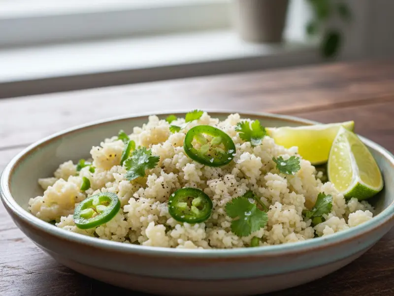 - Ralla la coliflor y saltea con cilantro, serrano, limón, sal y pimienta.