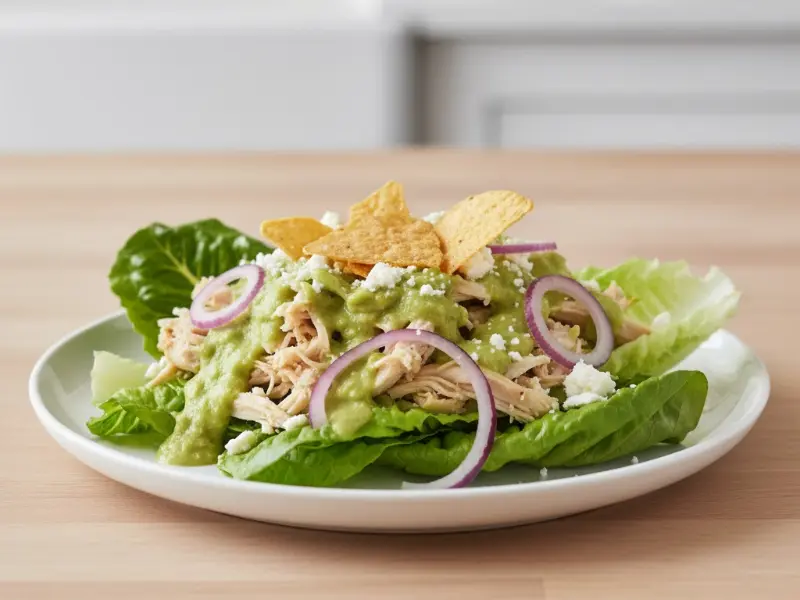 “Chilaquiles” de lechuga con pollo y salsa verde cremosa