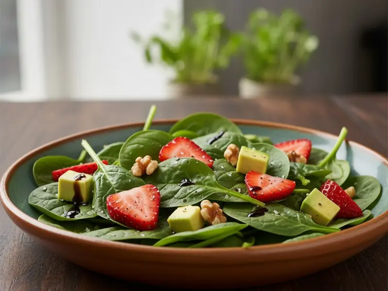 - Combina espinaca, fresa, aguacate, nuez y balsámico.