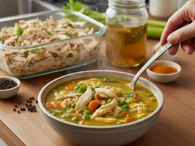 El pollo es el comodín de las cenas. Cocínalo en caldo aromático y guárdalo en porciones para resolver sopas, wraps y salteados.