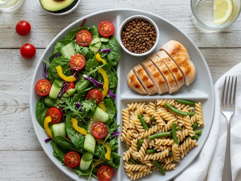 ❌ Porciones desbalanceadas: llenar el plato de harinas o proteínas y olvidar las verduras.