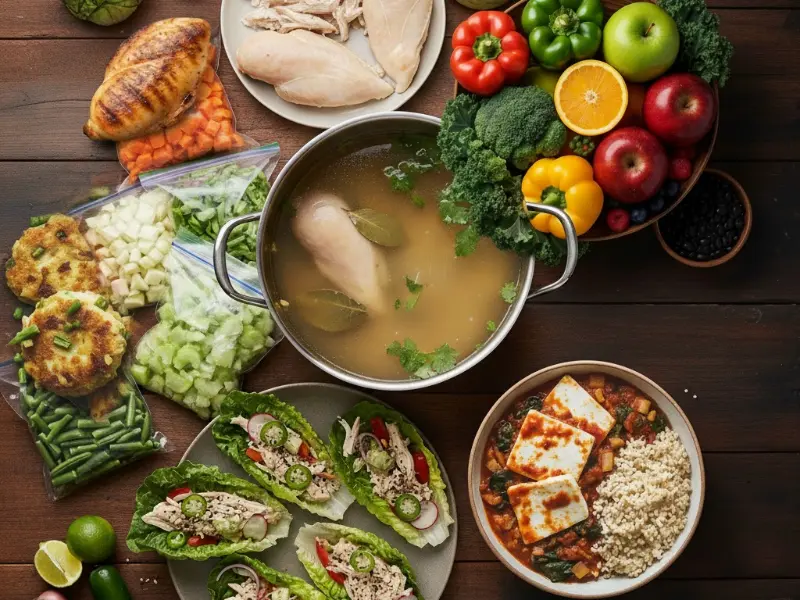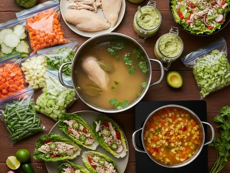 Deja listos un caldo ligero, una proteína versátil, una salsa sabrosa y vegetales picados para acelerar todo.