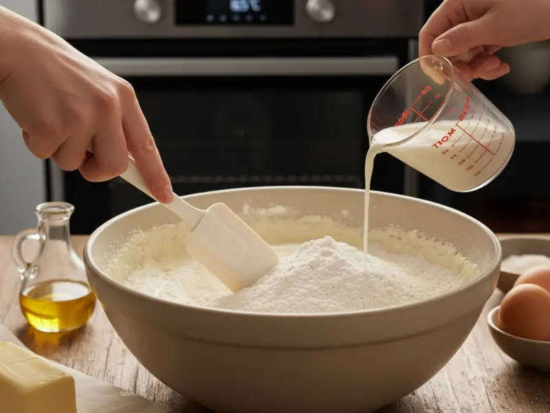 Agrega la mezcla de harina en tres partes y la leche tibia en dos, comenzando y terminando con harina.