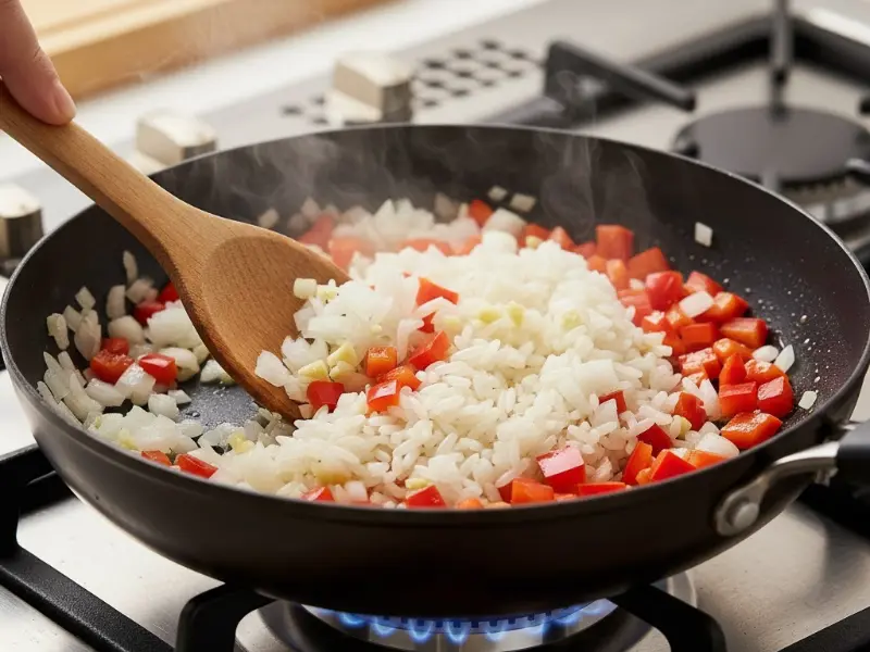 • Remueve constante mientras sofríes el arroz para un dorado parejo sin quemar.