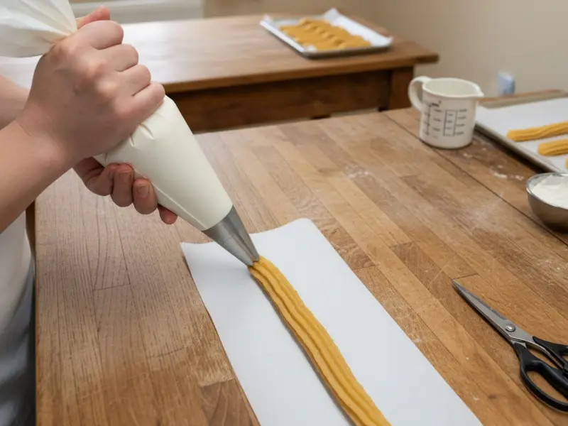 - Coloca los churros con la manga, cortando con tijera el largo deseado.