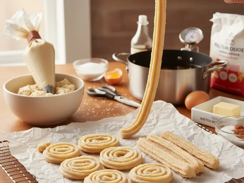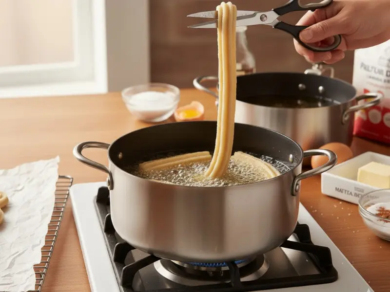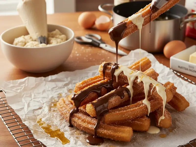 Los churros recién hechos crujen al morder y perfuman la cocina con azúcar y canela.