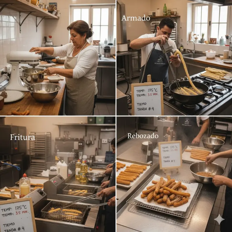 Divide tu área en cuatro estaciones: masa, armado, fritura y rebozado. Así cada persona o paso fluye sin estorbar al siguiente.