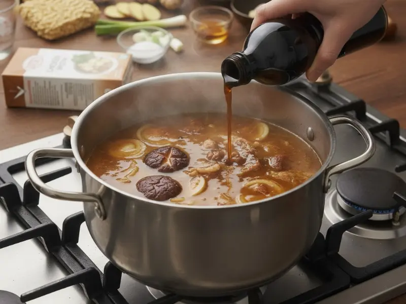 Para el caldo, mezcla dashi o caldo de pollo con un poco de salsa de soya y una cucharadita de azúcar.