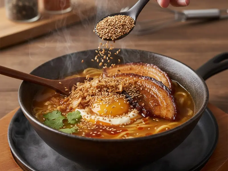 Añade chalotas fritas o semillas de ajonjolí tostadas justo antes de servir.