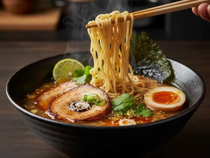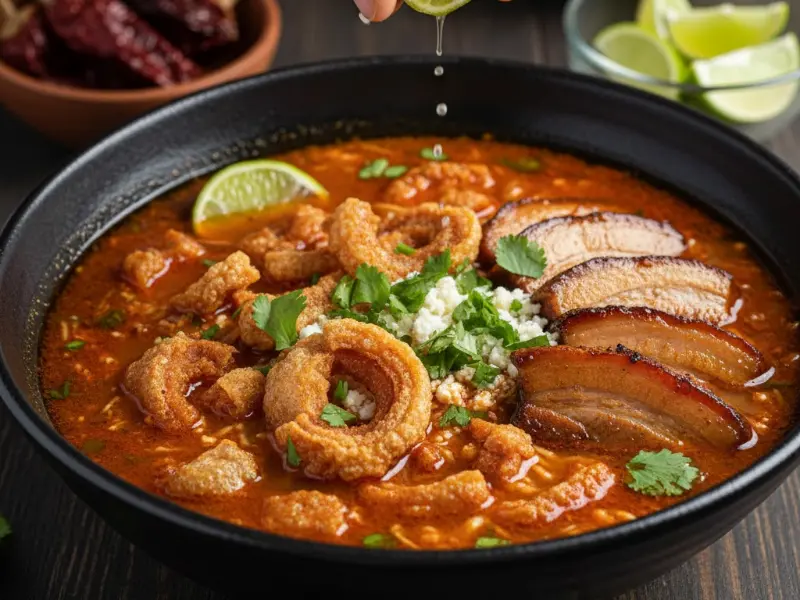 Prueba un ramen mexicano con chile guajillo, chicharrón y un toque de limón.