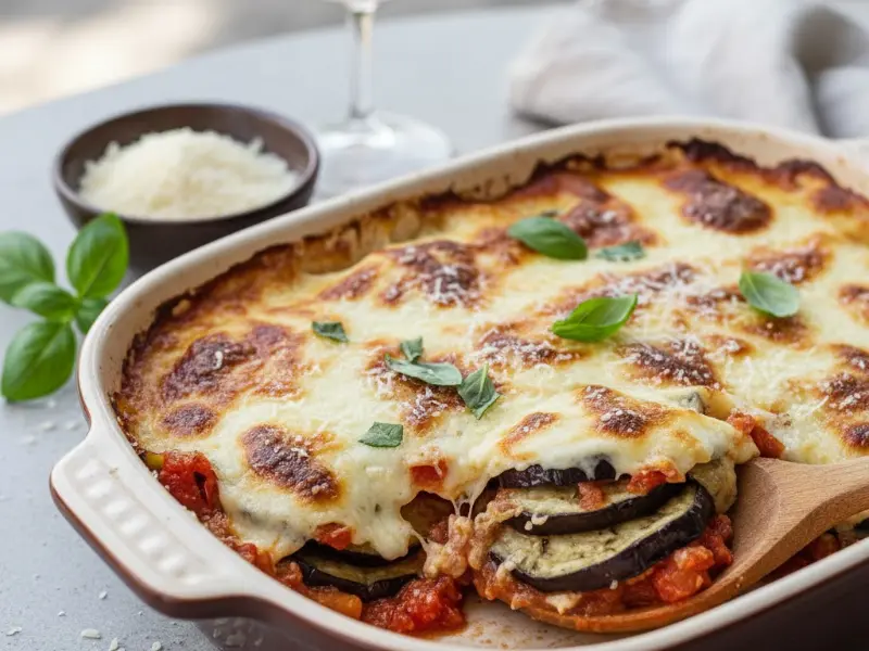 - Monta capas en fuente: salsa, parmesano, berenjena. Repite y termina con salsa, parmesano y mozzarella opcional.