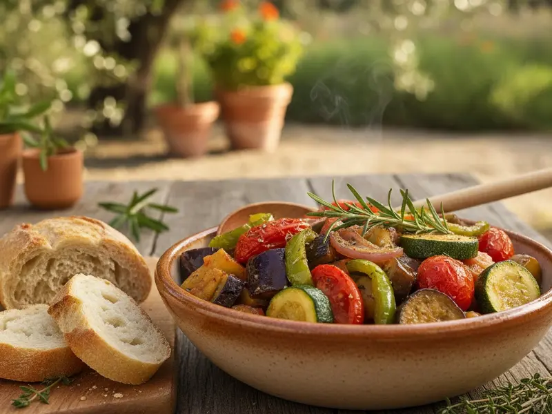 Guiso vegetal que sabe a huerto y vacaciones. Funciona como plato principal ligero o como guarnición con pan crujiente.