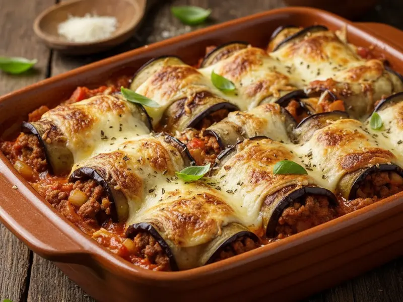 - Rollitos de berenjena con carne y queso gratinado