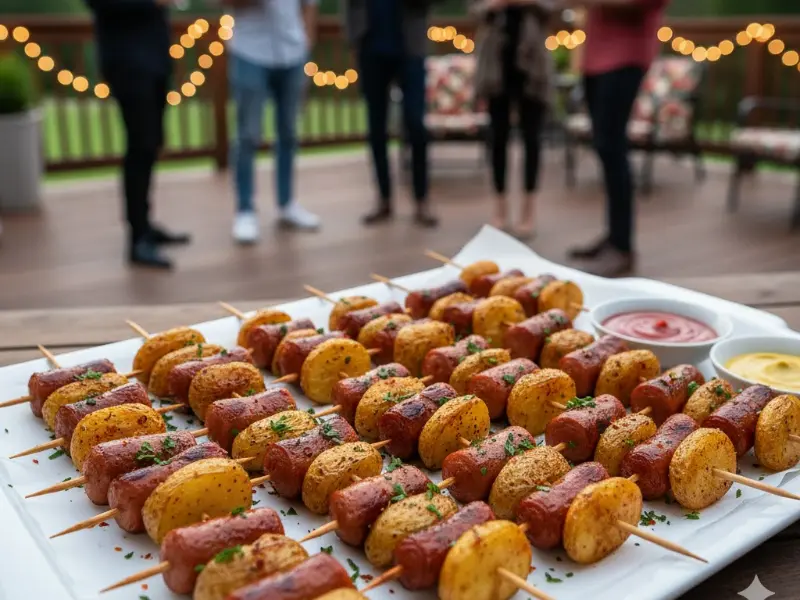 Solo alterna papitas fritas con trozos de salchicha en palillos y sirve en bandejas.