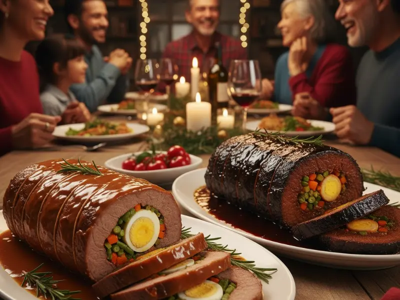 Se arma con carne molida extendida sobre film, rellena con jamón, queso, huevo y verduras, y se enrolla firme para hornear.