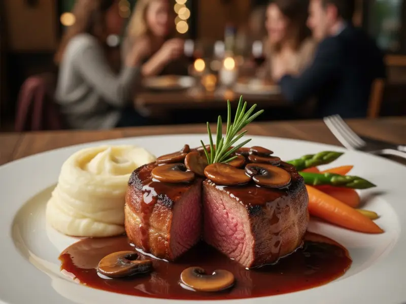 El lomo de res se envuelve en tocino, se sella en sartén y se termina con una salsa hecha del mismo jugo, vino tinto y champiñones.
