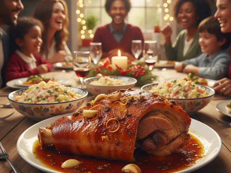 Una joya festiva de las fiestas familiares. Se marina con ajo, jugo de naranja y especias, y se hornea a fuego bajo hasta que la carne queda tierna y aromática.