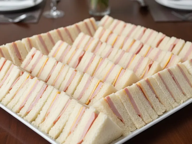 Pan suave, una capa de queso y otra de jamón, cortados con precisión y acomodados en filas.