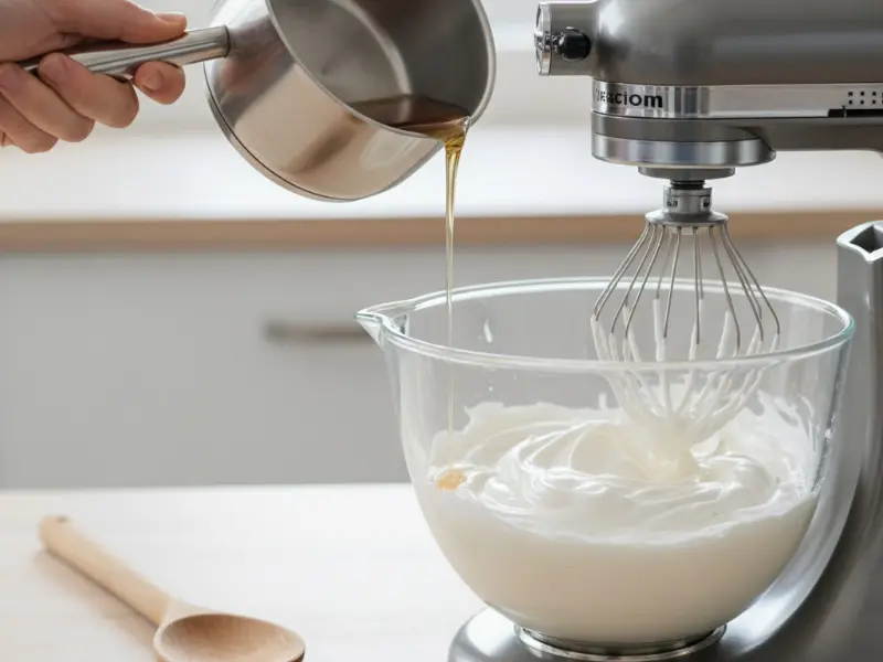 - Vierte el almíbar caliente en forma de hilo fino por el borde del bowl mientras bates a velocidad media. No dejes que toque las varillas directamente para evitar salpicaduras peligrosas.