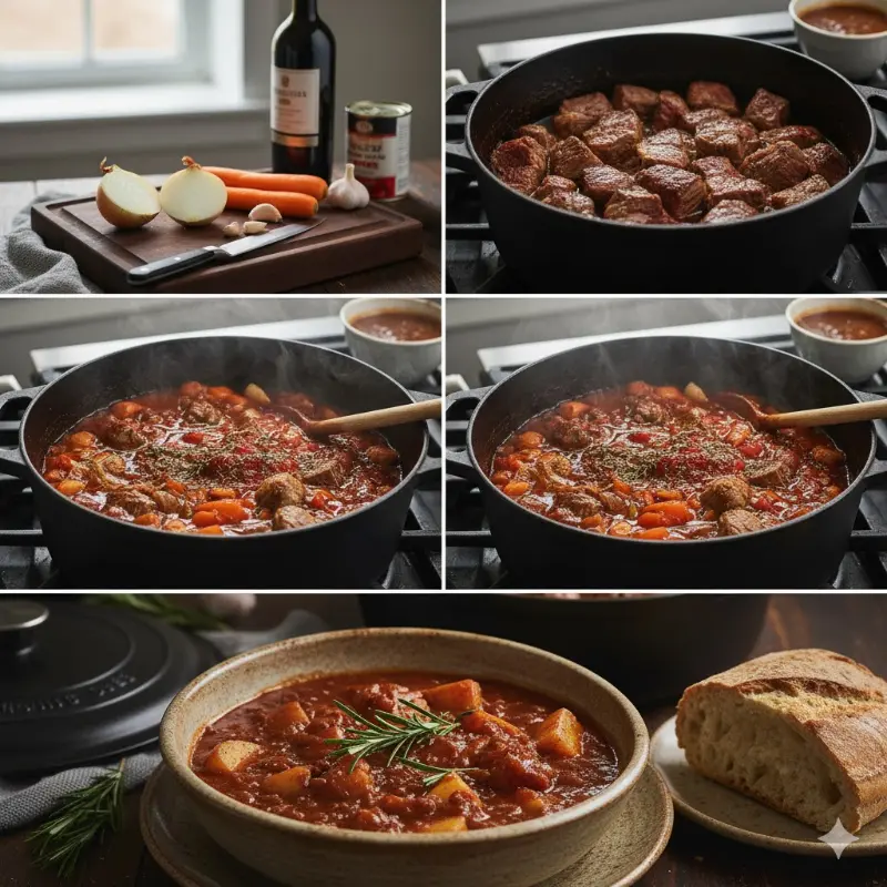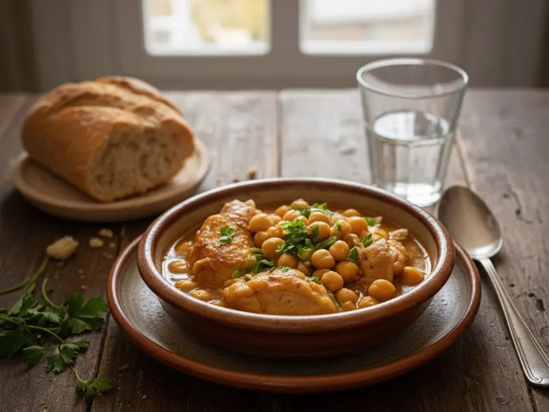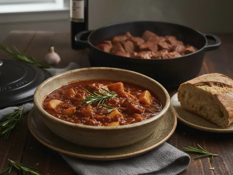 De cocción tranquila y sabor profundo. La carne se vuelve tierna y las patatas absorben una salsa que pide pan.