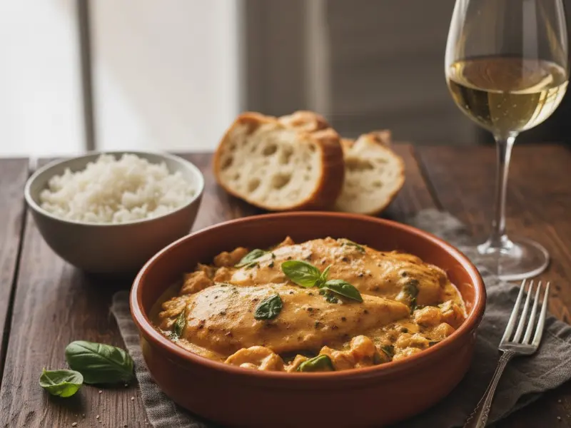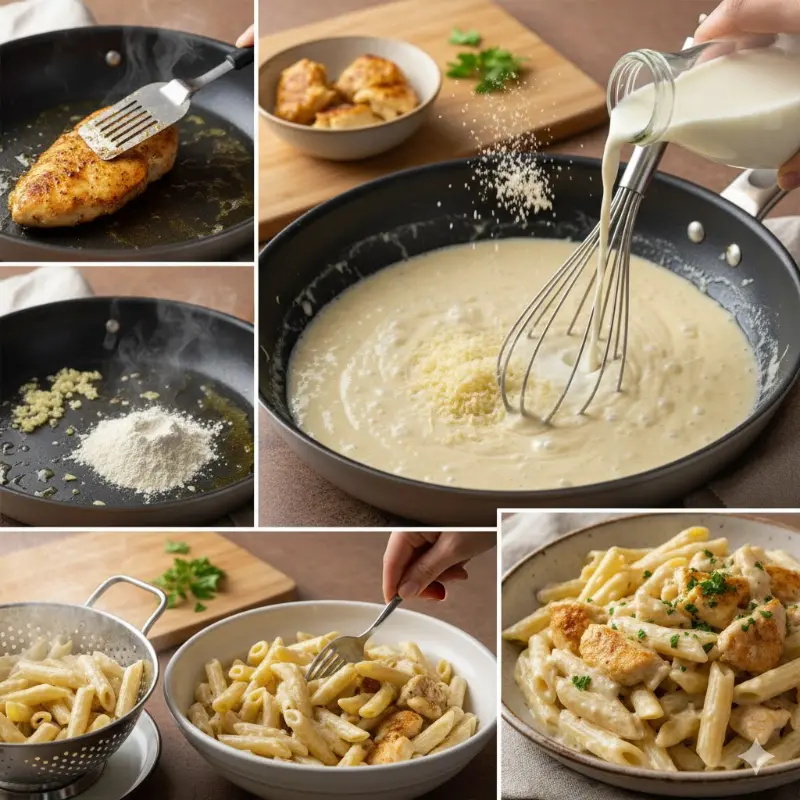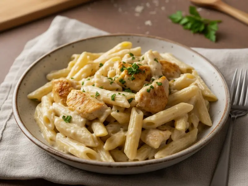 En pocos pasos logras una salsa que abraza la pasta y realza el dorado del pollo. Ideal cuando quieres comer rico sin invertir horas.