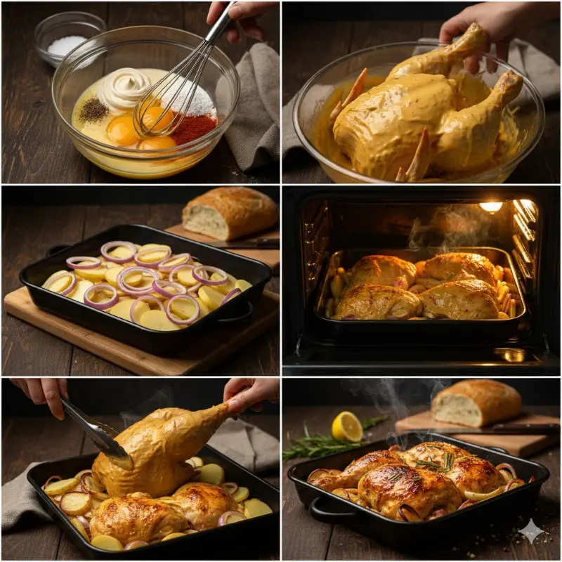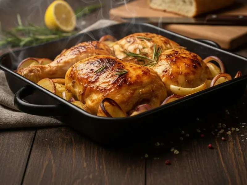 - En una bandeja, coloca patata y cebolla. Encima, el pollo.