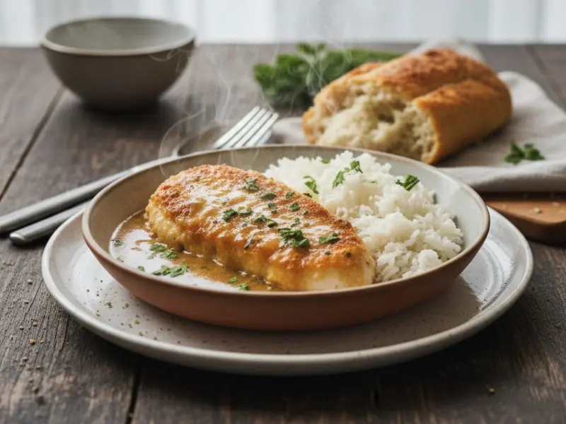 Pollo empanado en salsa tradicional