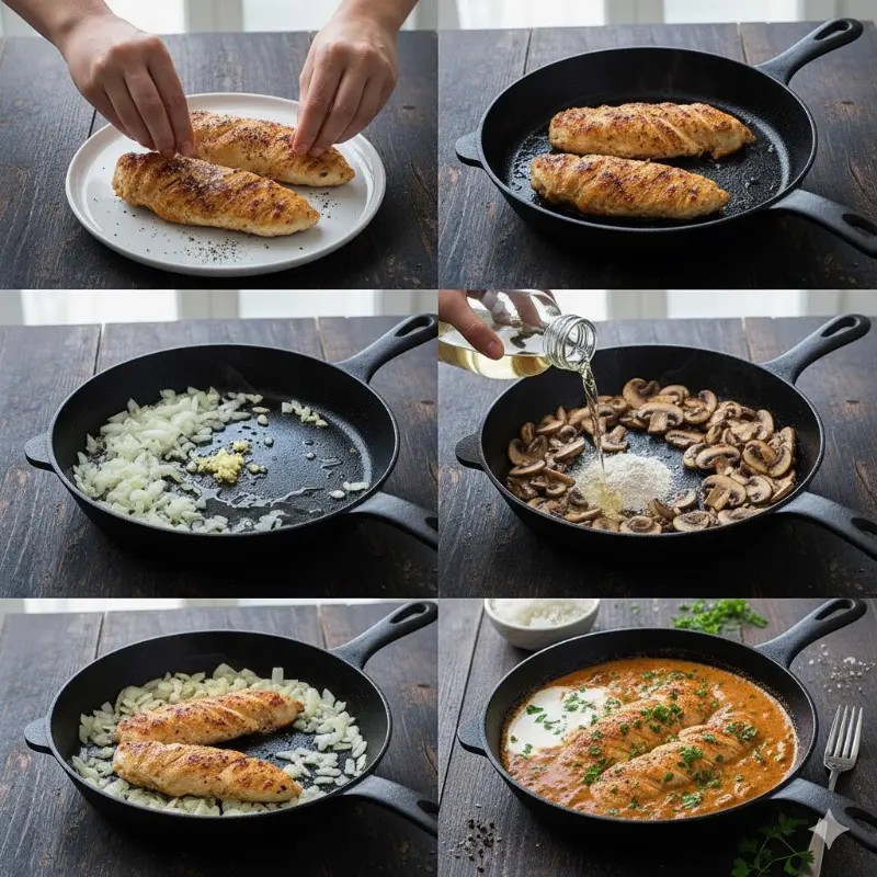 Sellamos primero, luego construimos una salsa cremosa con fondo de setas.