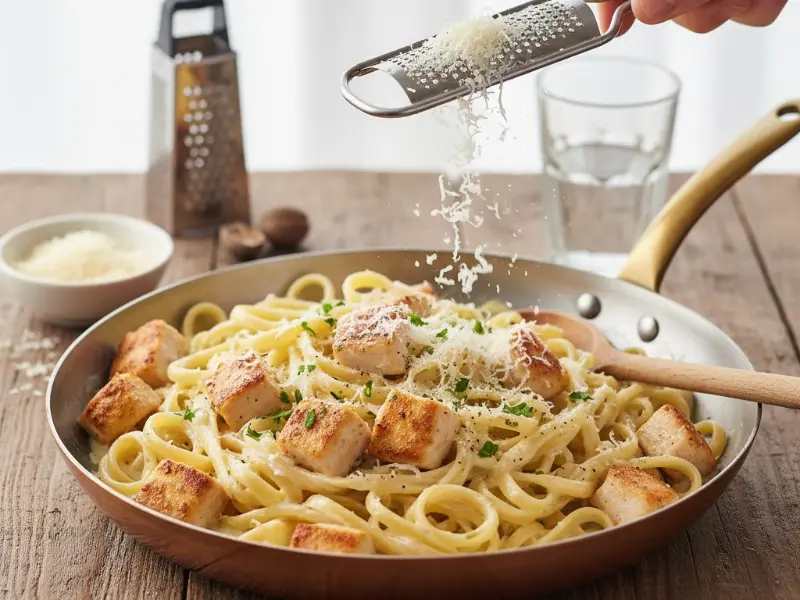 Añade queso rallado y nuez moscada. Integra la pasta cocida, devuelve el pollo y ajusta con agua de cocción si hace falta.