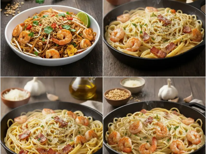 Saltea ajo, agrega gambas y rompe un huevo batido tipo revuelto. Incorpora los noodles cocidos y la salsa.