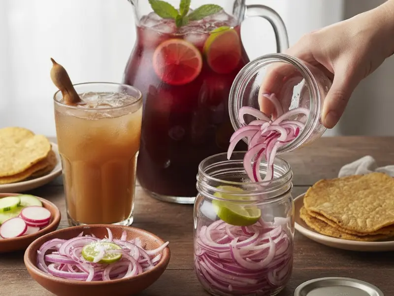 - Si usarás cebolla morada, córtala en plumas y cúbrela con agua caliente, limón y sal. Déjala reposar 10 minutos y escúrrela.