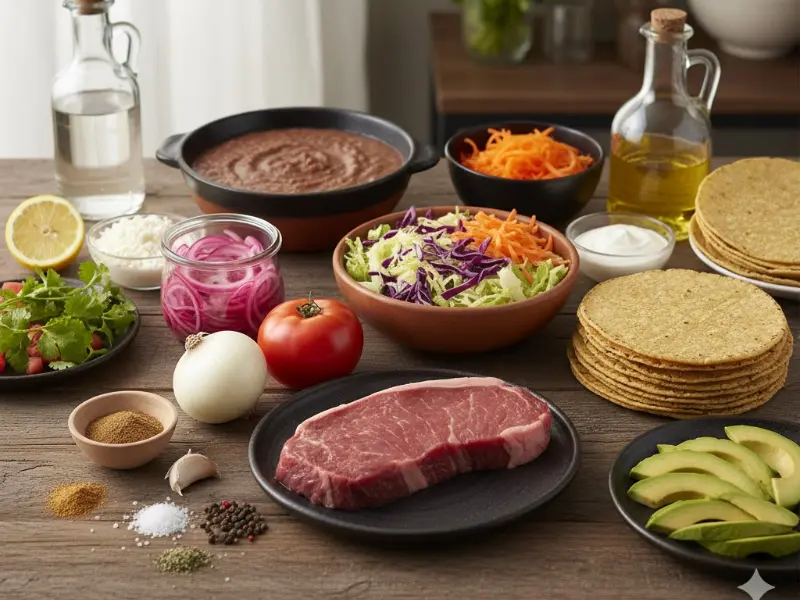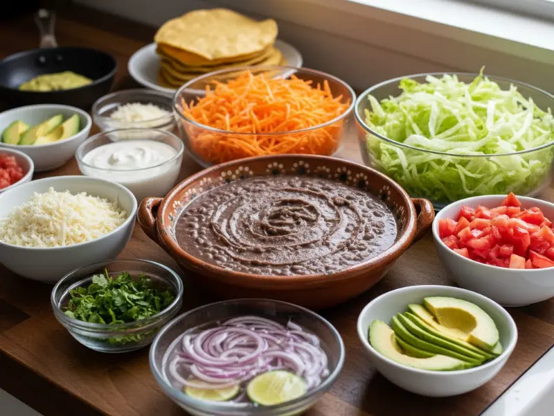 - Coloca todos los ingredientes en recipientes individuales: carne, frijoles, verduras, crema, queso y salsas.