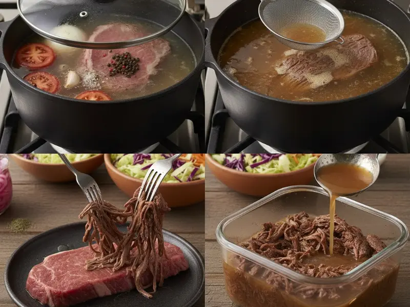 - Cuando la carne esté lista, apaga el fuego y deja reposar dentro del caldo unos 10 minutos.