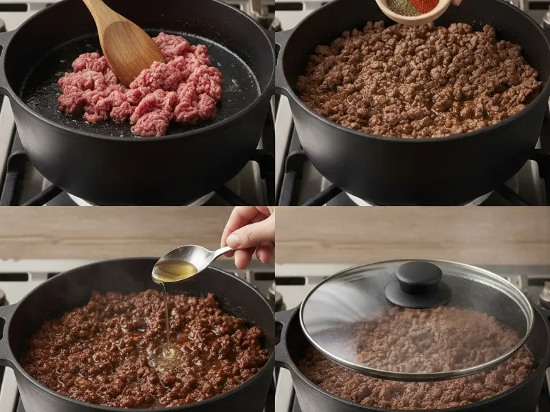 - Agrega la carne molida y cocina a fuego medio, moviendo con una cuchara para deshacer los grumos.