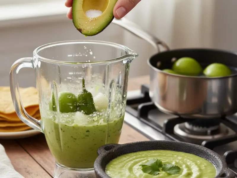 - Licúa con medio aguacate, sal al gusto y un chorrito de agua fría.
